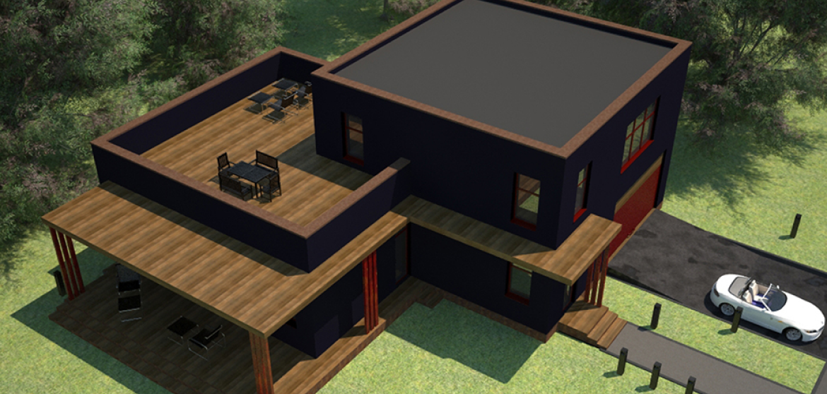 Компактный дом для семьи из трех человек, выполненный в формате принципа «необходимо и достаточно». Геометрия дома складывается из двух кубиков, которые на пересечении объемов образуют общее пространство.
