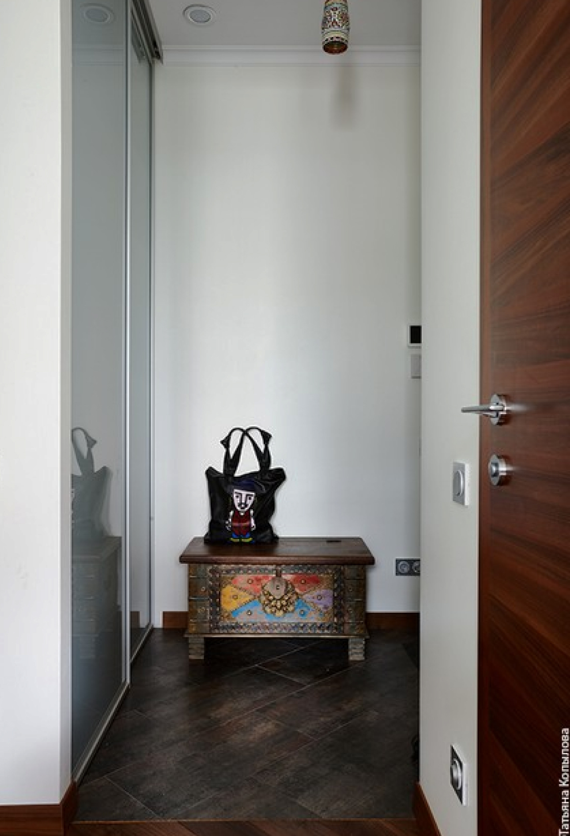 Именно на этом объекте был придуман прием узкого сопровождающего коридора, параллельного гостиной и системе хранения в виде масштабного параллелепипеда, который выстроен значительно ниже потолка. В него встроен холодильник, а со стороны узкого коридора — гардероб и системы хранения. В результате еще нескольких, таких же эффективных идей и приемов, образовалось удобное, многофункциональное, эстетически выверенное пространство.