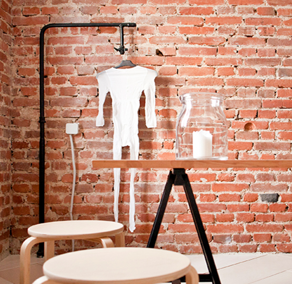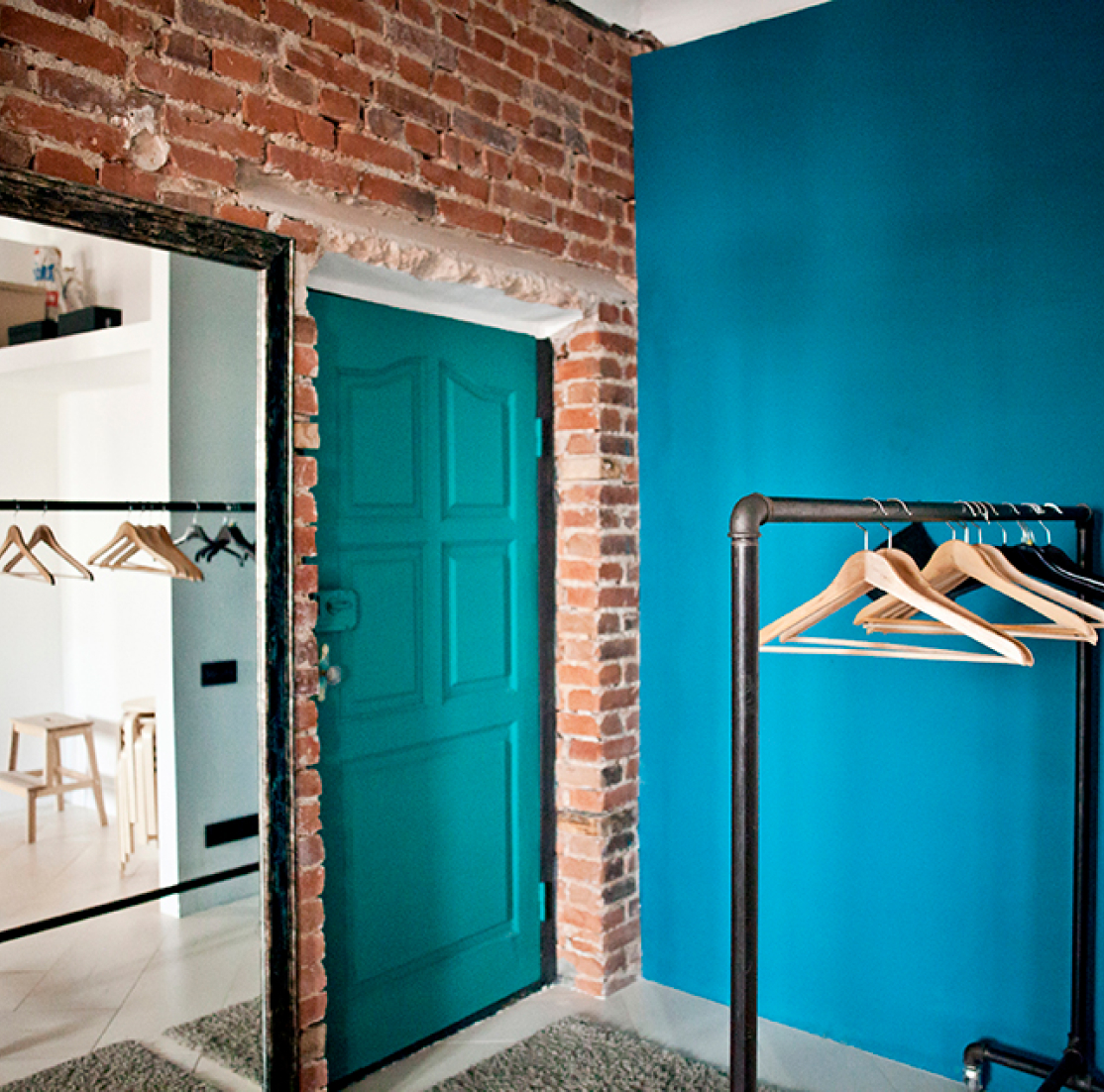 Основные моменты: родной кирпич, пол в «елку» из березовой фанеры, оригинальные потолочные карнизы, которые частично сохранились и в дополнение к ним потолочные карнизы из гипса, балки из ржавого железа, такая же люстра с плафонами из настоящего хрусталя, кирпич за стеклом в душевой, два бирюзовых цвета рядом.