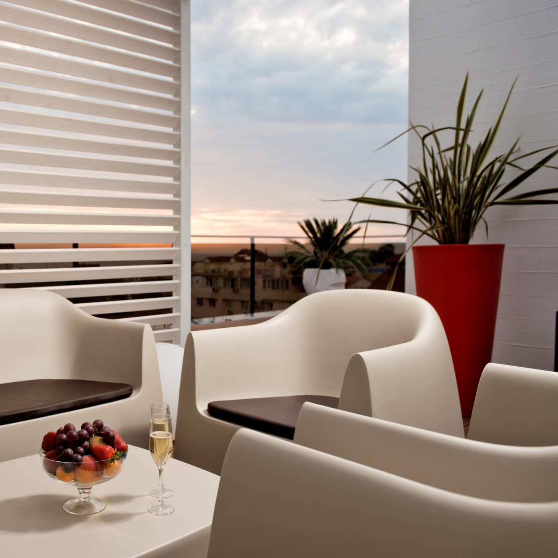 Терраса на крыше задумана и организована полноценным открытым пространством с беседками, баром, бассейном и местом для загара. Все обустроено мебелью и аксессуарами Vondom, растениями, освещением, профессиональным звуком и цифровым экраном, предназначенным для круглогодичного использования на открытом воздухе. Cамая трудная задача на открытых террасах — это интеграция тени и зелени на площадку и это удалось, благодаря беседкам, большому кол-ву живых растений и газонов.