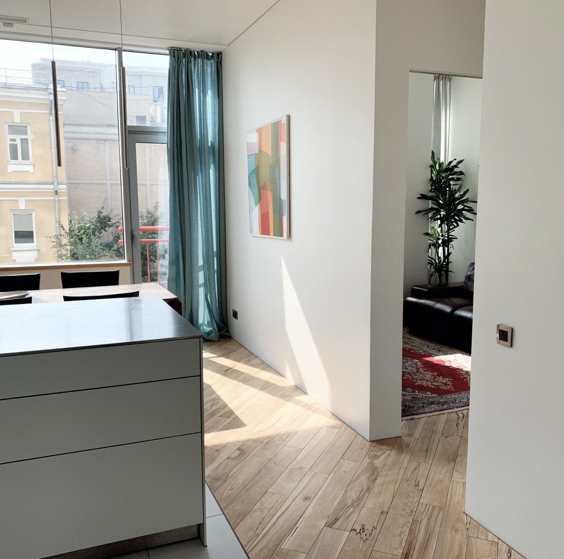Эстетика стиля подкреплена светом стеклянного периметра, массивной доской под названием «черная береза», краской одного цвета, европейской мебелью ligne roset и этнической мебелью от «Тик-Хаус», живописной плиткой bardelli и такой же живописной декоративной штукатуркой от ProfiBrush. Кроме того, на стены прекрасно легла живопись Алексея Ланцева.
