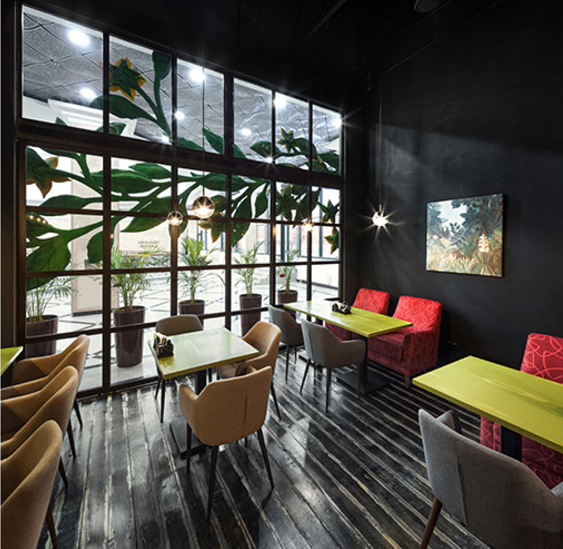 При первом знакомстве площадка вызвала бурю восторгов — крупный прямоугольник, приятная высота, возможность поставить стеклянный фасад. Было решено создать олицетворение сказочных джунглей, соединить их с восточным колоритом, использовать японский минимализм в геометрии пространства и китайские тональности в оформлении, деталях и мебели.